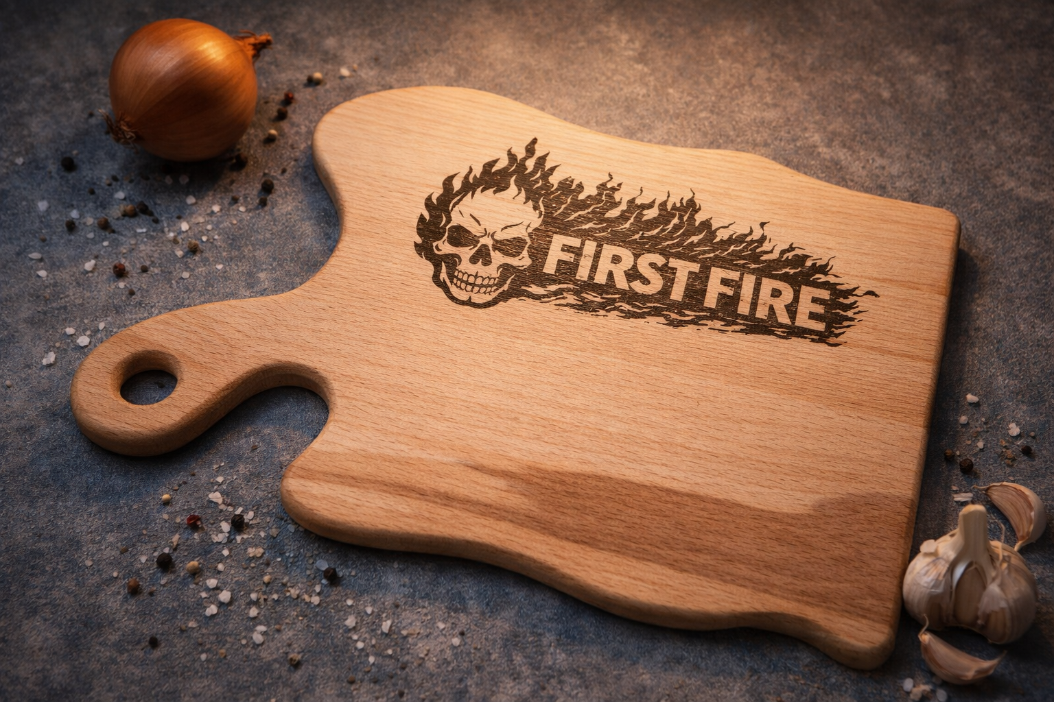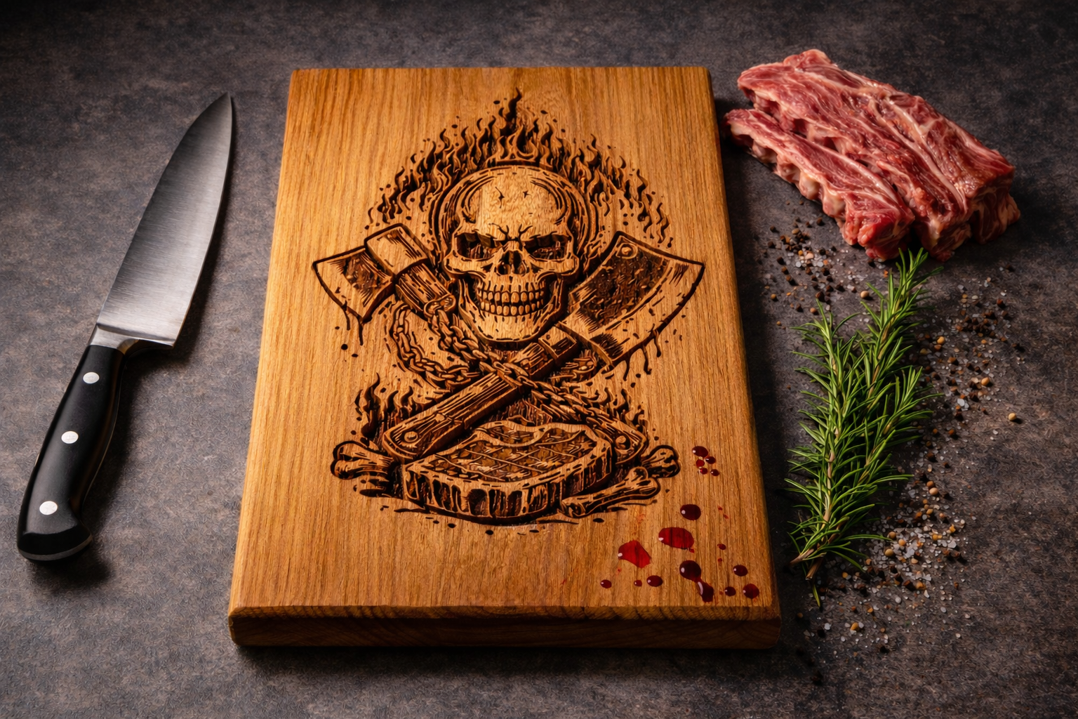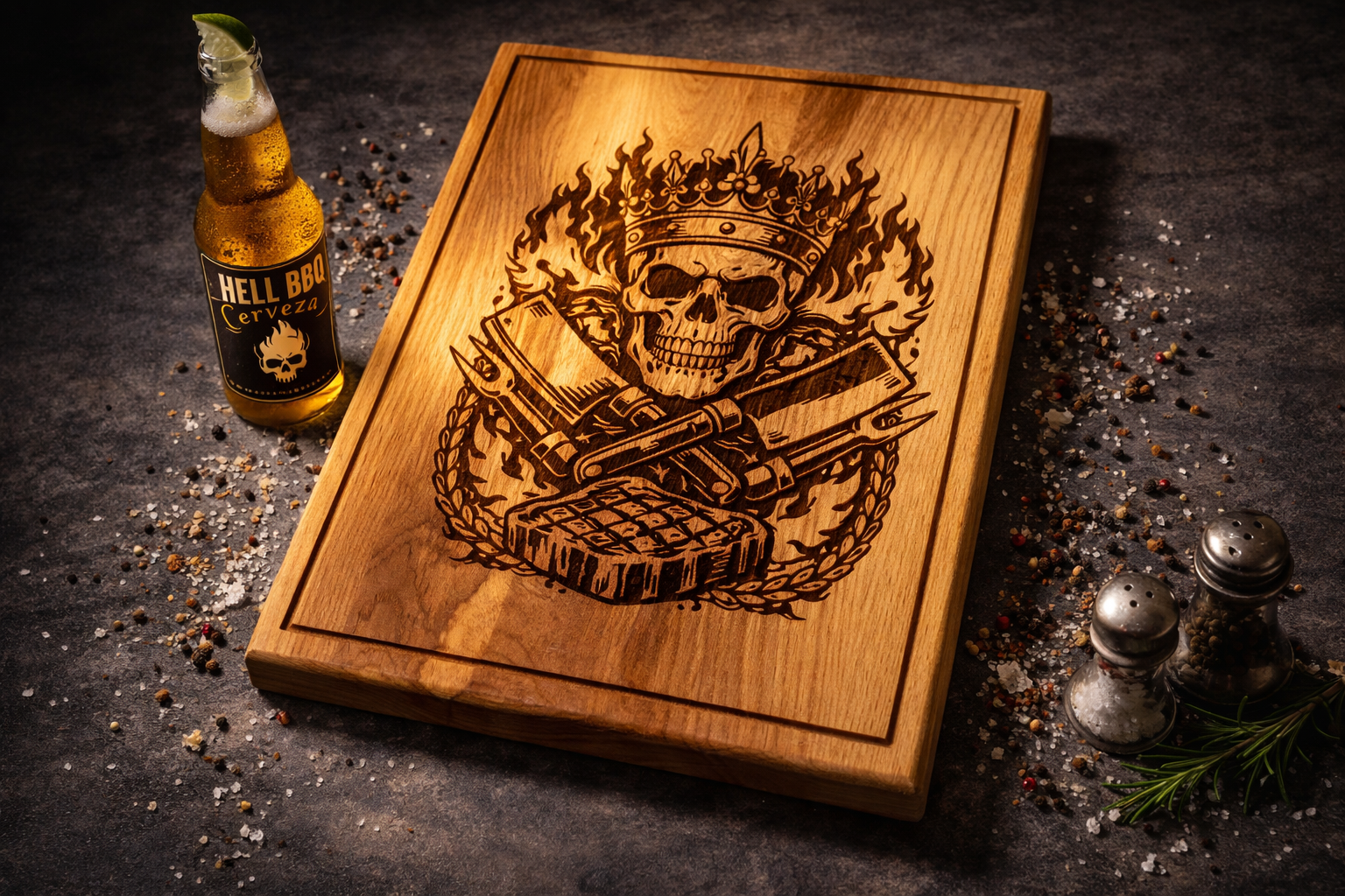 King – hlavní artefakt světa HELL BBQ. Masivní kus poctivého jasanového dřeva pro chvíle, kdy nechceš jen servírovat, ale ovládnout stůl.